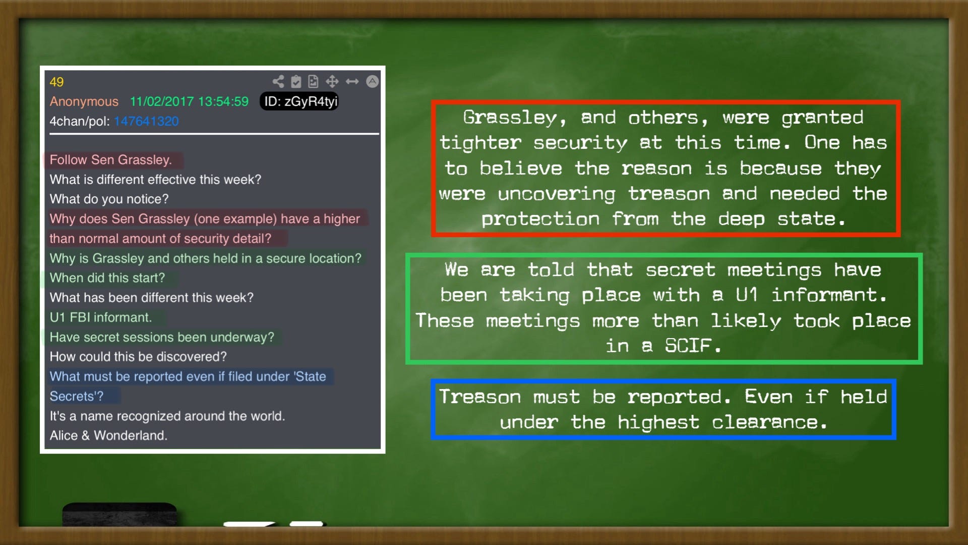 Early in the drops, Q mentioned SCIFs and asked to dig on what they are and what purpose they serve. In this drop, we see Q mention secret meetings taking place involving Grassley and others that centered around a Uranium One informant. One can assume these meetings were held in a SCIF due to the sensitive nature of the information being divulged.