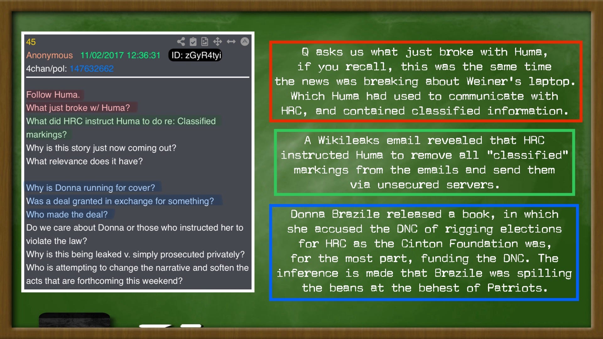 Again, it should be of interest to anyone reading this series that in the last couple weeks we have seen John Podesta and Huma Abedin both pop back into the public narrative, and they are two people Q mentions very early, and two people Q points towards as being indicted. We will have to wait and see what happens, but to me it certainly doesn’t seem like a coincidence.