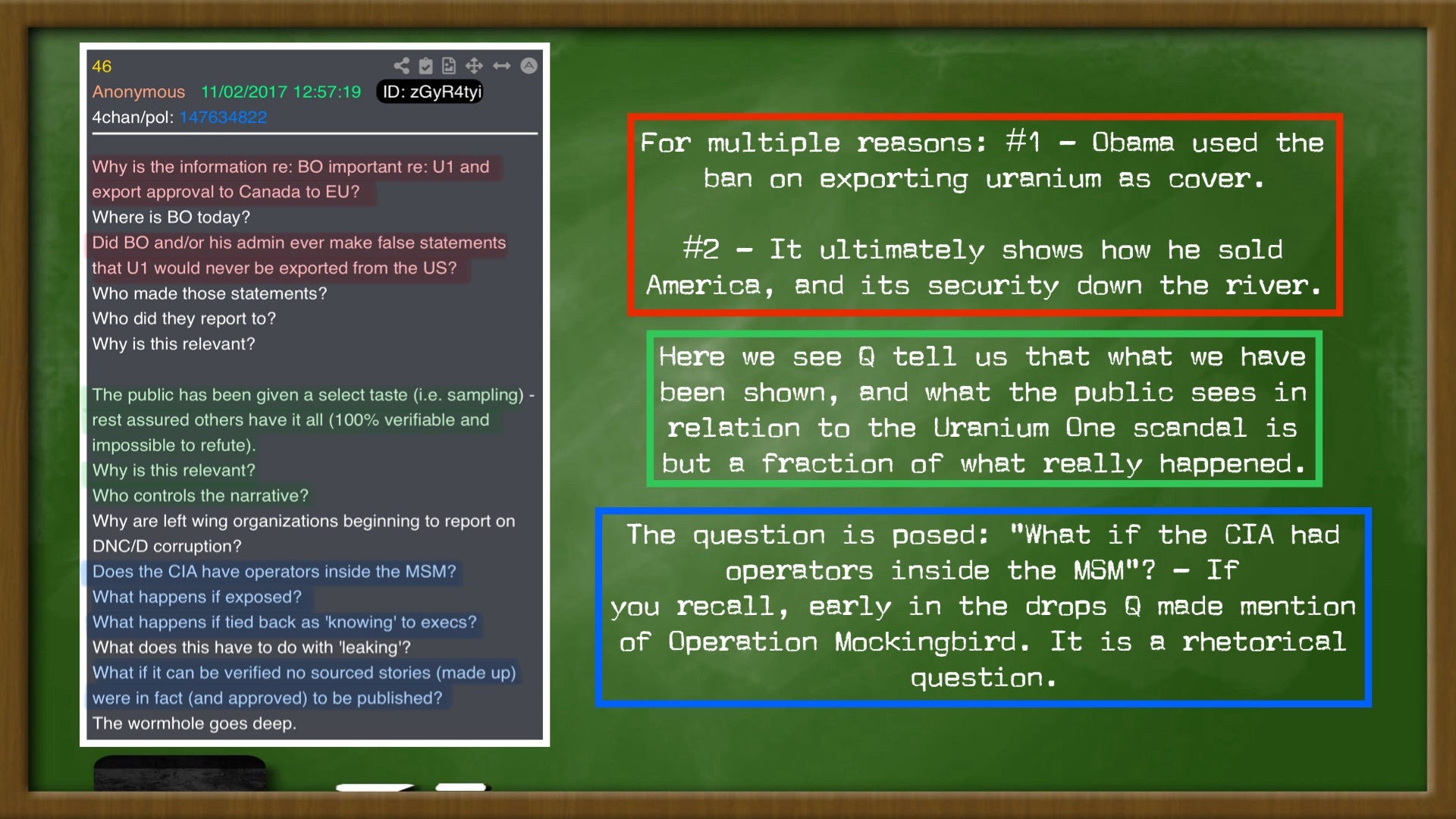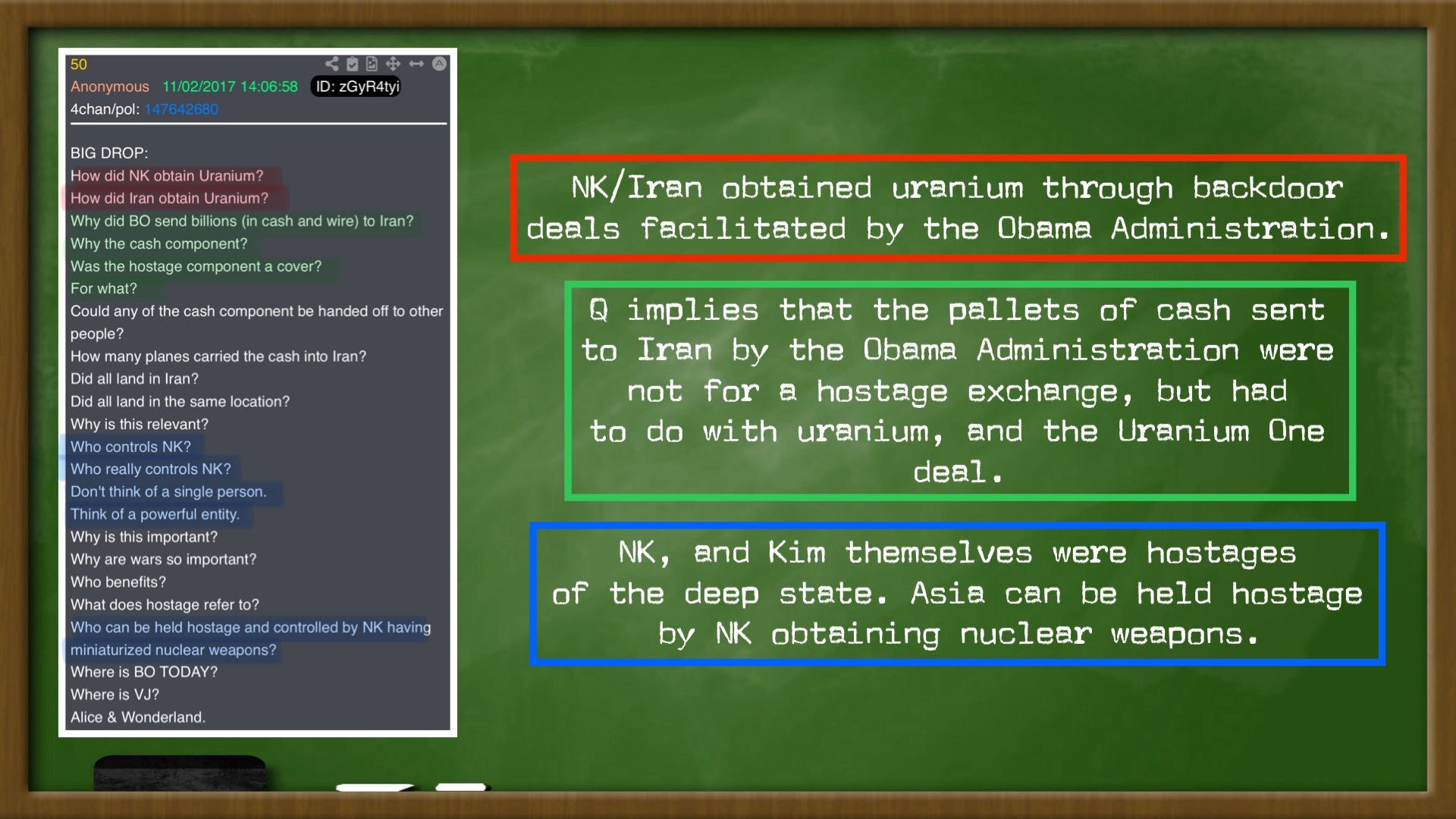 Again, we see Q go in hard on the Uranium One scandal, asking how Iran and North Korea both procured uranium. Simple—through the Uranium One deal, which was, of course by the design of the Obama Administration.