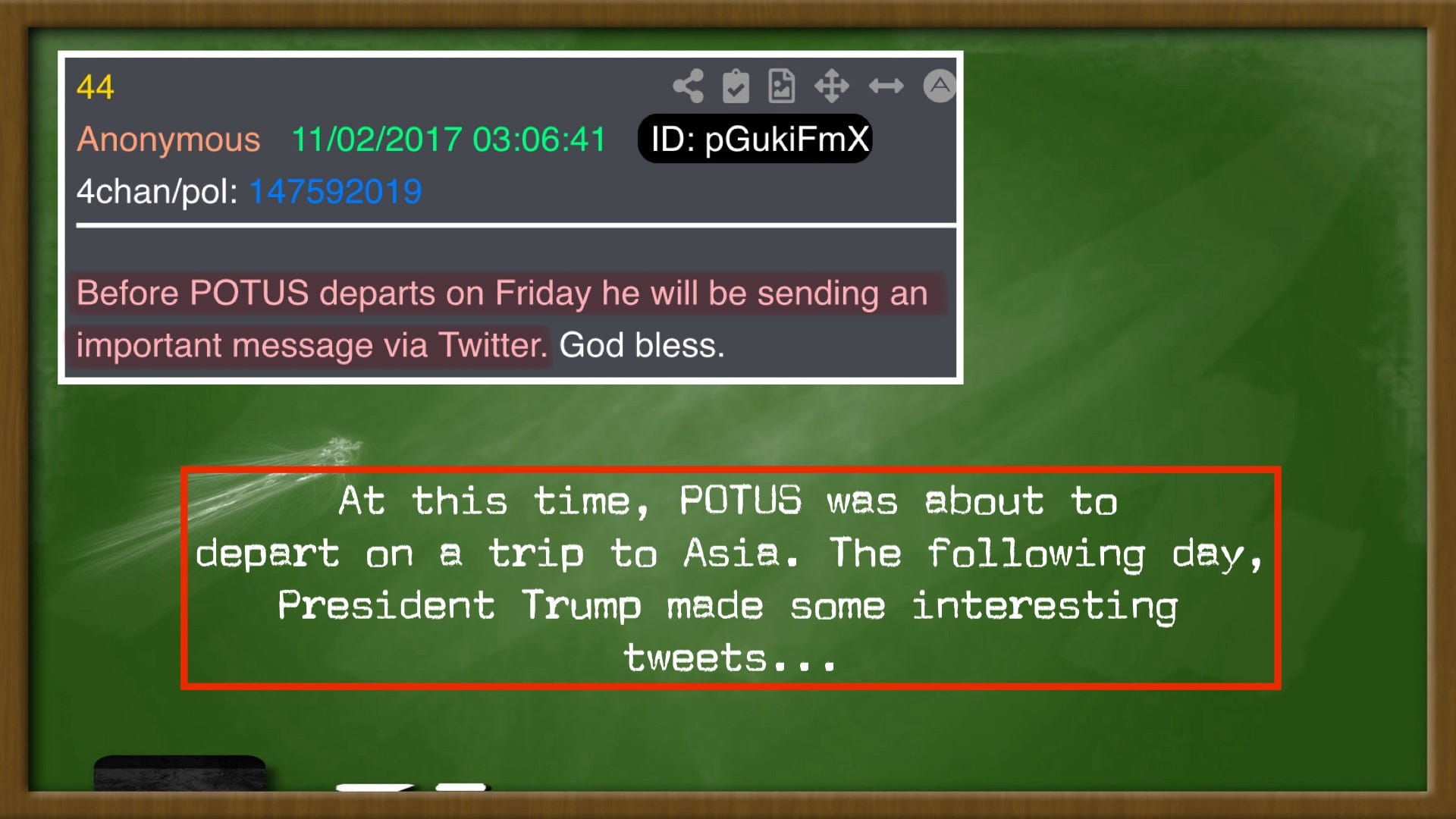 The first is that Q was referring to one of the tweets President Trump would make the following day.