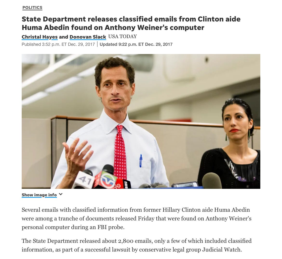 Specifically: The news that Huma Abedin and Hillary Clinton had been sending classified information back and forth through unsecured servers. One device that Abedin used to make these communications was her then-boyfriend Anthony Weiner’s laptop.