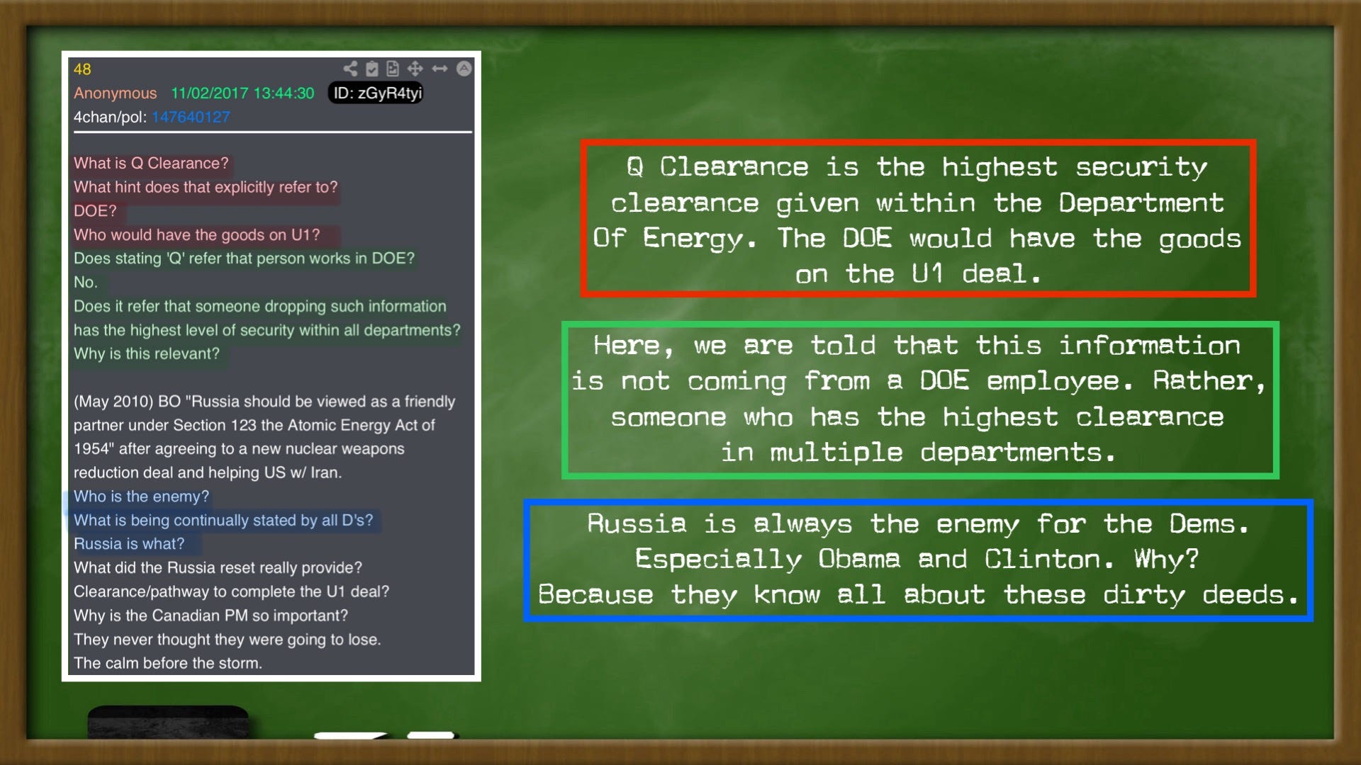 In this drop, Q is telling us that someone that possesses Q Clearance is the one providing the information about Uranium One. At the same time, he is telling us that it is someone that does not work within the DOE—rather, someone that holds a very high level of clearance across multiple agencies. This is important, as there are only a few people who would hold such clearance, including Admiral Mike Rogers, for instance, as well as the President himself.