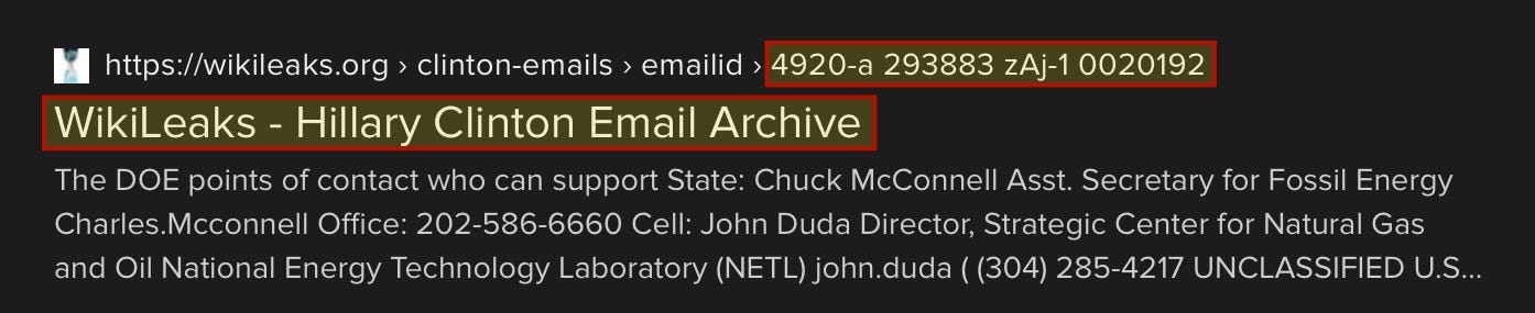 Below that, we see Q drop a sequence of numbers and letters. When you copy and paste these numbers, you will find that they lead to the Wikileaks Hillary Clinton Archive, as seen below: