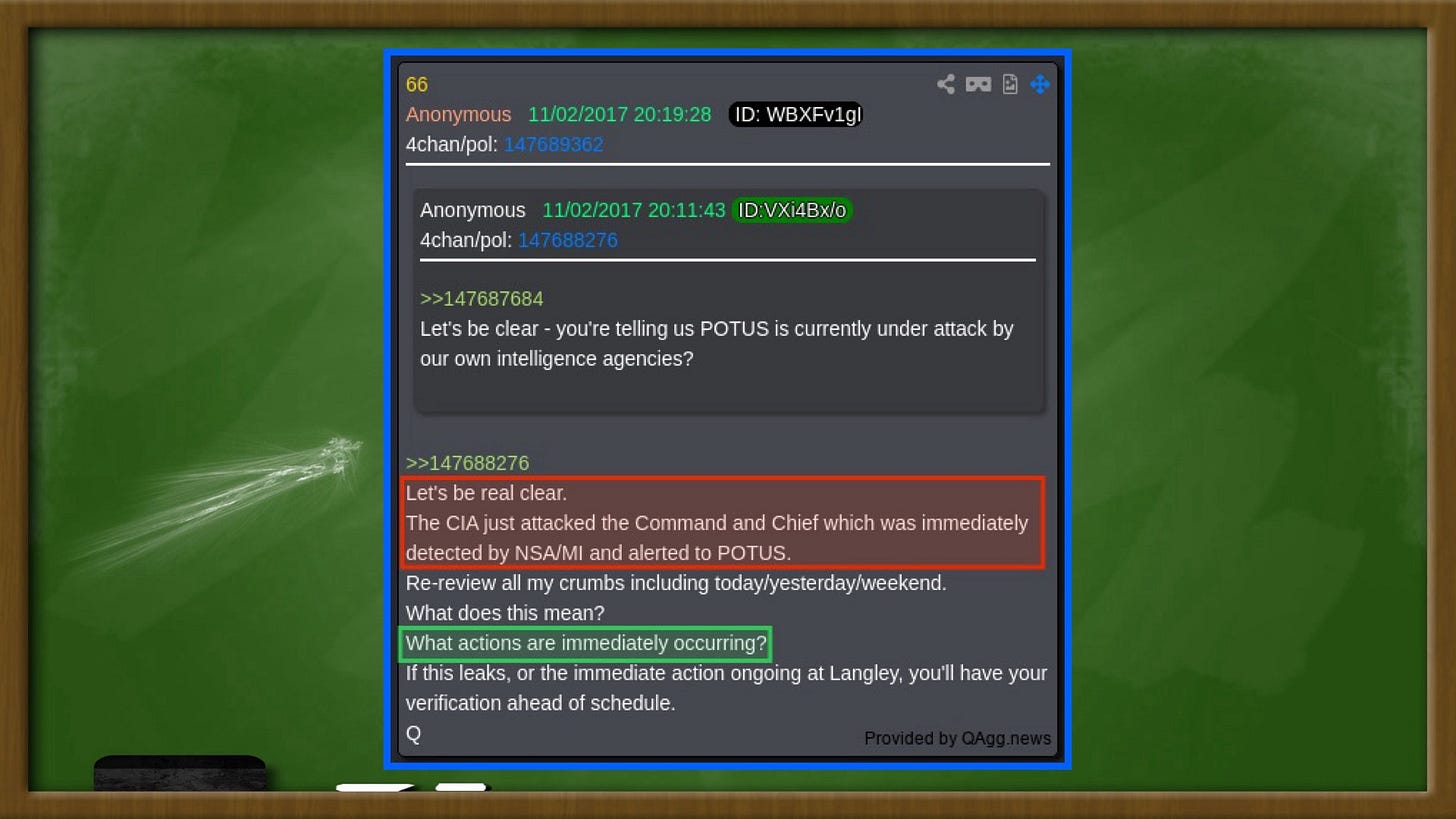 Here, we see Q replying to an Anon. The Anon asked Q if POTUS was being attacked by his own intelligence agencies. This attack was detected by white hat elements within the NSA, and POTUS was immediately made aware. This means that within a mere week of the Q Drops’ existence, [they] have become so unsettled that they have begun attacking POTUS directly, and of course, this attack also signals that big tech is involved as well.