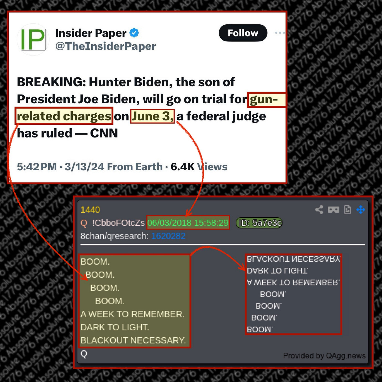 Q Drop 1440 just so happens to have been made on June 3rd, 2018 - a 6 year delta to when Hunter Biden’s trial will begin. Not only that, but this drop also has a pretty peculiar pattern to the text. A pattern which, when turned upside down and mirrored makes a gun.