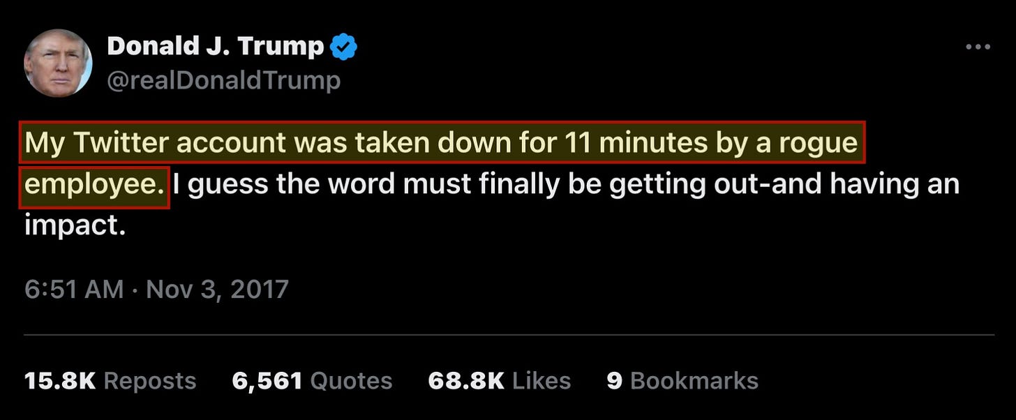 We see an example of this here, as a rogue Twitter employee took down President Trump’s Twitter account for 11 minutes. Recall the earlier drop mentioning this very scenario. (Sidenote: This Tweet carries more relevance than many yet realize, IMO. More to come on that on my own Substack in the future.) The official excuse given by Twitter was that the removal of Trump’s account was an accident. Q assures us that it wasn’t.