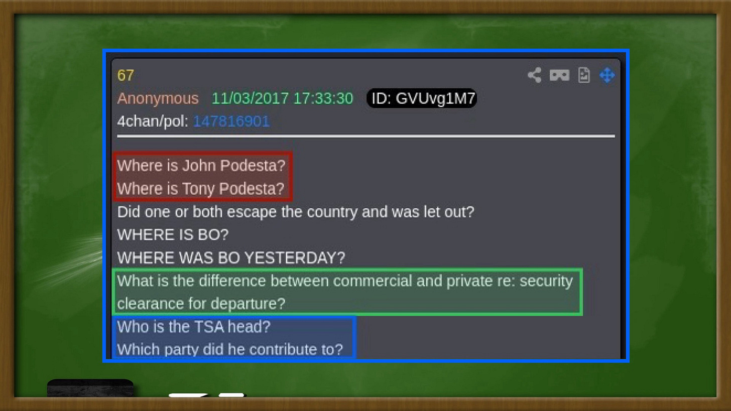Q adds on to the request from the prior drop, and asks anons to begin assembling a graphic containing all the crumbs that have been dropped so far. Spoiler alert: Anons don’t disappoint. This will become apparent within a few more drops.