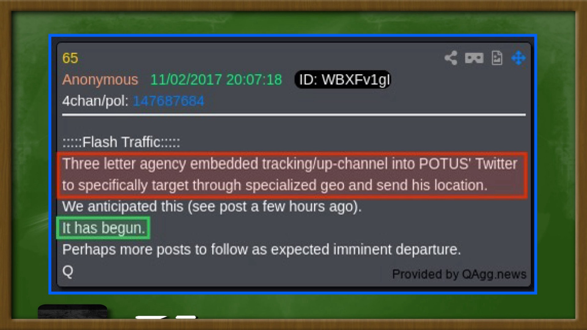 It is my take that “It has begun” is Q telling the board that the war has officially become hot to the public eye (even if they are unaware). To this point, we hadn’t yet seen [them] really make any moves against POTUS to this degree. But within days of Q’s first drop, [they] became panicked enough to take down Trump’s Twitter account and install tracking software on to it.