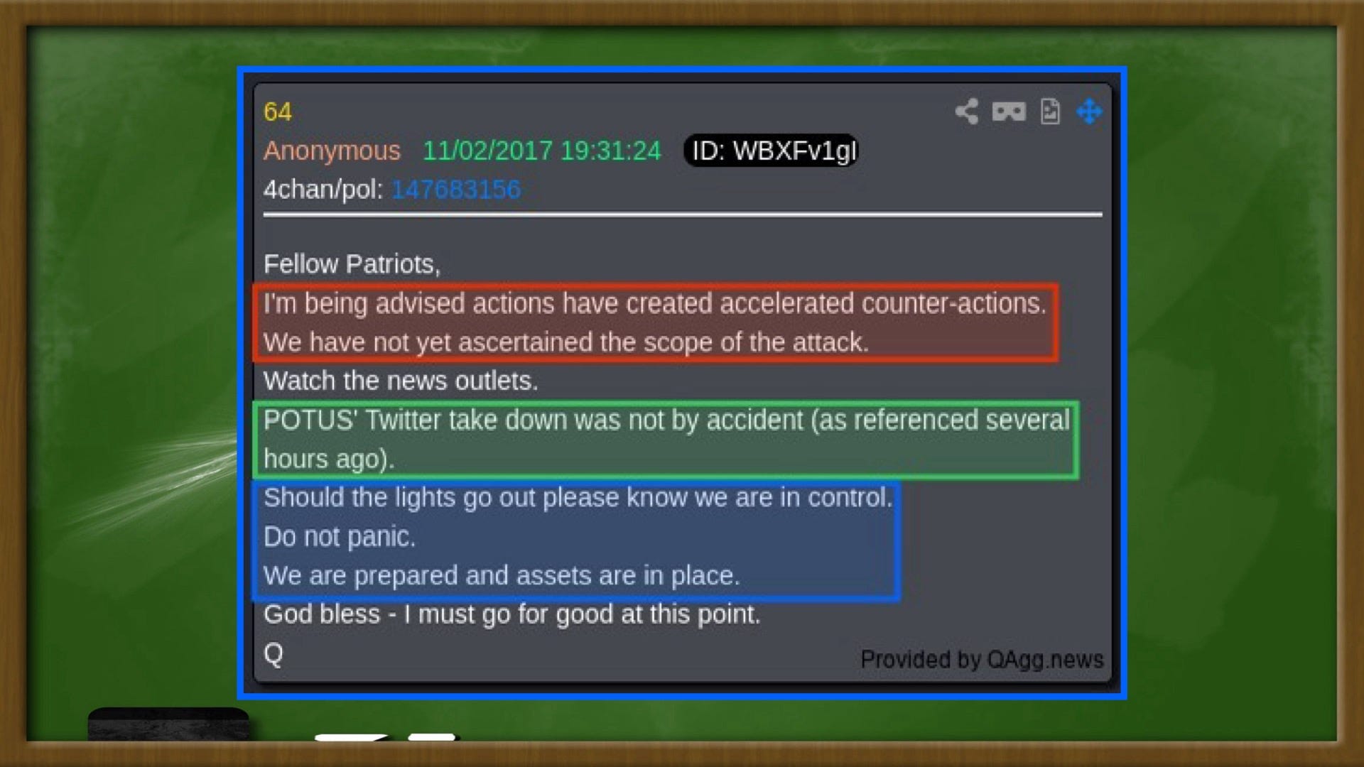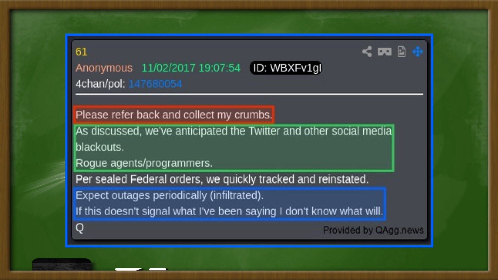 The last point I have highlighted is one in which Q tells us to expect random blackouts of various platforms (this can also be expanded to include social media accounts as well). Q’s inclusion of the word “infiltrated” is saying that despite the best efforts of the white hats, there would be rogue employees and bad actors that would still cause service disruptions from time to time.