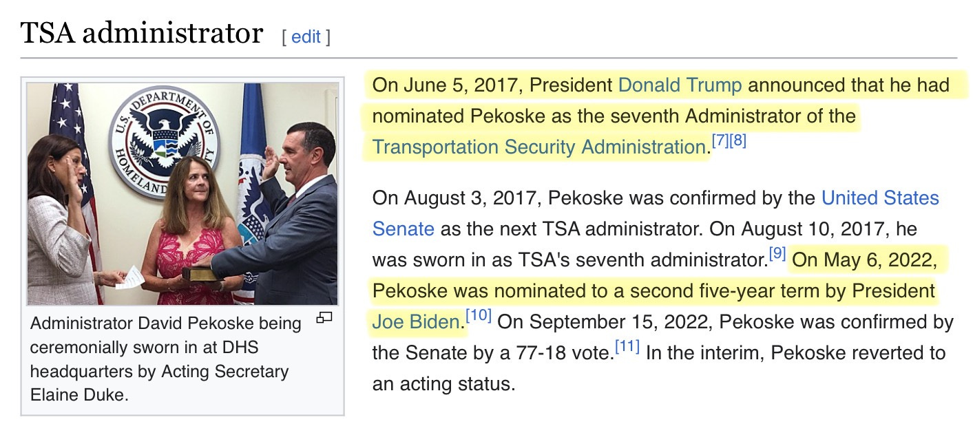 He was also nominated by President Trump, and nominated again by Resident Biden - which, if you believe in Devolution may well be a little more proof of that theory. That is, if this fellow is actually a Patriot who was reporting on the deep states flights and movements. As director of the TSA, he would have access to flight logs and other flight data that others wouldn’t.