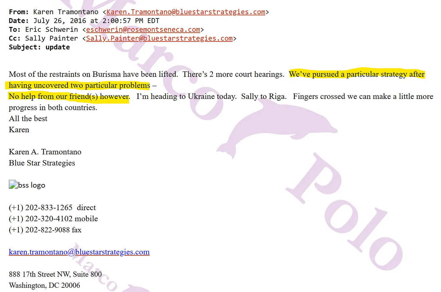 Vadym revealed that the “ultimate purpose” of a contract with Blue Star Strategies was to get “widely recognized and influential current and/or former US policy-makers” to “close down for any cases/pursuits against Nikolay in Ukraine.”