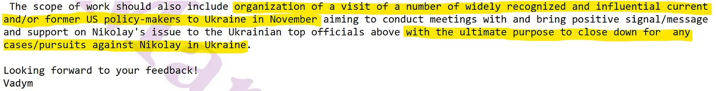 The final part of this email specifically states what the “ultimate purpose” was in signing the contract with Blue Star. Vadym wanted the scope of work to “include organization of a visit of a number of widely recognized and influential current and/or former US policy-makers to Ukraine in November” to “conduct meetings” and show “support on Nikolay's issue to the Ukrainian top officials above with the ultimate purpose to close down for any cases/pursuits against Nikolay in Ukraine.”