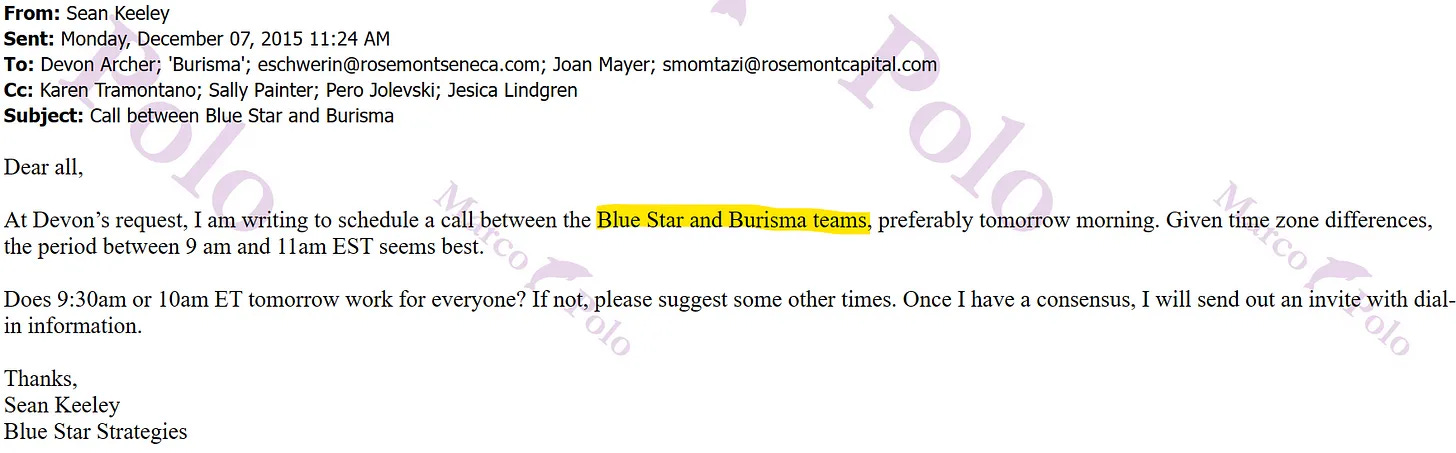 Emails show that on December 7th, Devon requested a call between “the Blue Star and Burisma teams.”