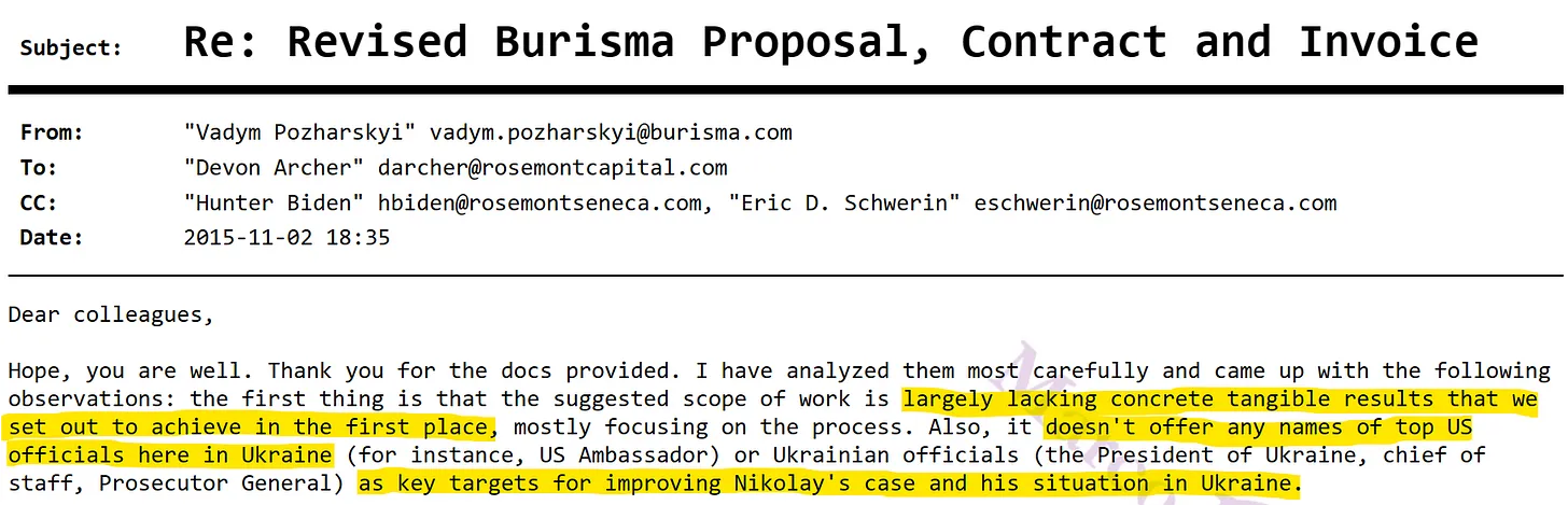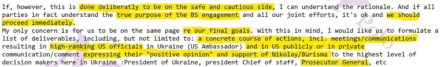 He then stressed that everybody be on the same page regarding their “final goals.” He wanted a list of deliverables which would include “concrete course of actions, incl. meetings/communications resulting in high-ranking US officials in Ukraine (US Ambassador) and in US publicly or in private communication/comment expressing their "positive opinion" and support of Nikolay/Burisma to the highest level of decision makers here in Ukraine: President of Ukraine, president Chief of staff, Prosecutor General, etc.”