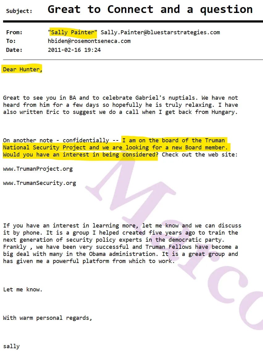 A search for “Sally Painter” on Bidenlaptopemails.com shows she had been in contact with Hunter as far back as 03/04/2010. On 02/16/2011, Sally emailed Hunter, asking if he would consider a position on the board of the Truman National Security Project: