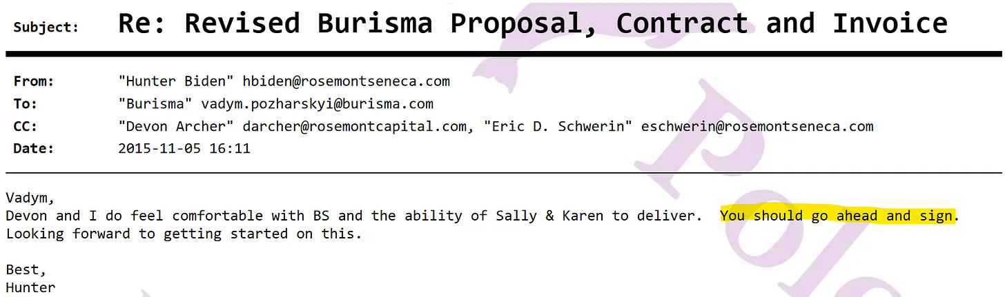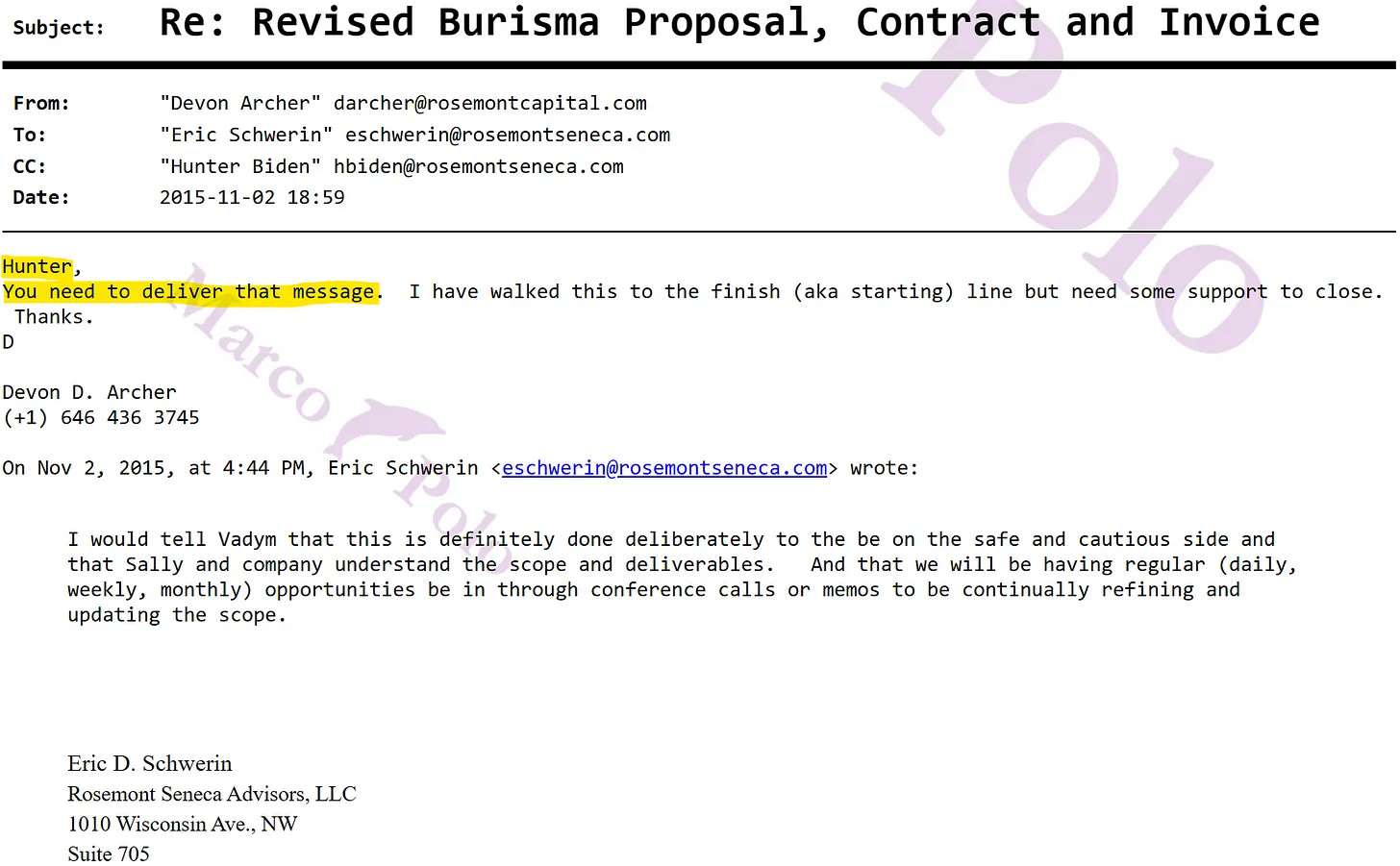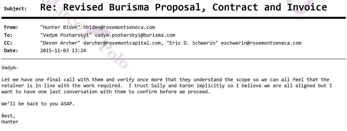 Here is where Sally Painter and her Blue Star Strategies came into play, hence the beginning of their contact with the meeting referenced above. One week after that scheduled meeting, an email chain of ‘forwards’ and ‘replies’ titled “Revised Burisma Proposal, Contract and Invoice” began to be exchanged amongst Sally, Rosemont Seneca, and Vadym.