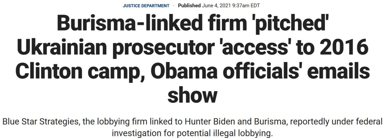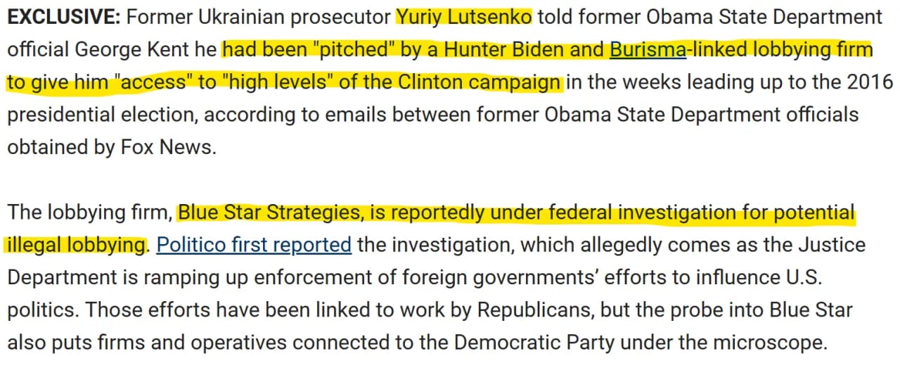 "Yuriy Lutsenko ... had been "pitched" by a Hunter Biden and Burisma-linked lobbying firm to give him "access" to "high levels" of the Clinton campaign in the weeks leading up to the 2016 presidential election."