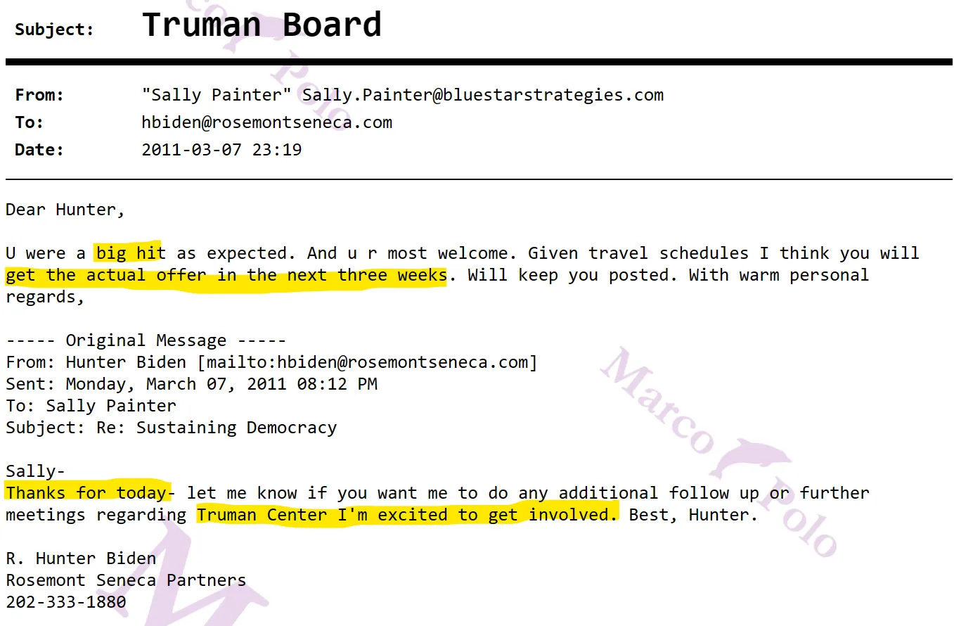 The following month, an email exchange titled “Truman Board” revealed Hunter thanking Sally saying he was “excited to get involved” with the Truman Center. Sally would respond that Hunter was a “big hit” and that Sally believed Hunter would “get the actual offer in the next three weeks.”