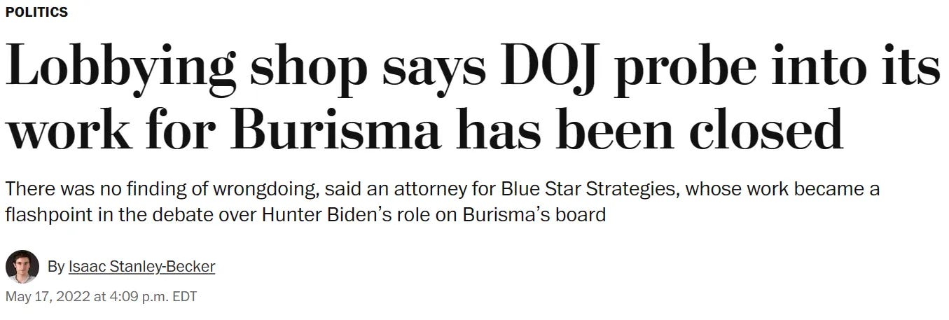 It should come as no surprise to anybody that in May of 2022, it was reported that the Biden DOJ-led investigation into Blue Star Strategies had been closed with "no finding of wrongdoing."