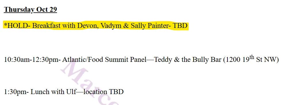 While still searching for “Sally Painter” on Bidenlaptopemails.com, the first thing I could find connecting Sally to Hunter’s dealings with Burisma is an email dated 10/23/2015 titled “Schedule for Next week.” The email listed out Hunter Biden’s schedule for the week of October 26th, 2015. The email revealed that there was a meeting put on hold between Hunter, Devon Archer, and Vadym Pozharskyi, along with Sally Painter.