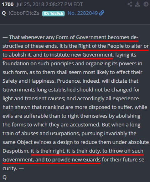 For emphasis, Trump said, [new Government]. He’s referring to a specific clause in the Declaration of Independence. “That whenever any Form of Government becomes destructive of these ends, it is the Right of the People to alter or to abolish it, and to institute new Government…”