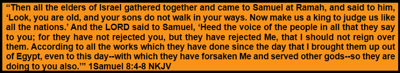 In 1 Samuel, the Bible records the crossroads where the Israelites rejected God’s freedom and begged to have a “king to judge us like all the nations.” This is important, so I’ll spend some more real estate to discuss parts of chapter 8.