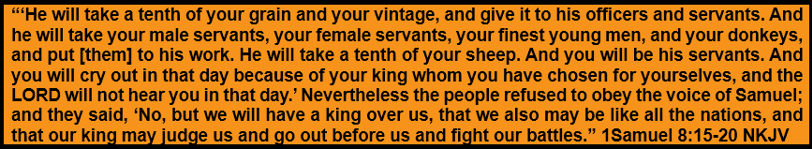 Lastly, God warned kings would demand a portion of the grain, wine, and sheep, while laboring donkeys, male/female servants, and the finest young men. Stated differently, kings would demand taxes. At the end of this long list of abuses, God emphasizes [and you will be his servants]. The root word used here for servant, “ʿeḇeḏ,” also means slave, subject, and worshipper. Let that sink in!