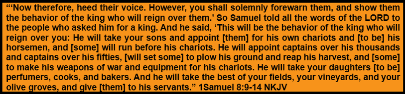 God warned kings would reign over the nation, taking sons and daughters as servants in the military, fields, factories, kitchens, and other industries. Stated differently, kings would demand sovereignty. God warned kings would take the best property and redistribute the stolen wealth to others. Stated differently, kings would reap without sowing. Sounds like socialism.