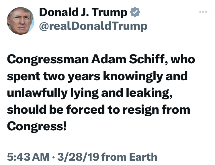 "Congressman Adam SCHIFF, who spent two years [knowingly] and unlawfully lying and leaking, should be forced to resign from Congress!" [Knowingly] [Knowingly] [Knowingly] Leaking investigations can lead to [forced] resignations. [Knowingly] disseminating FALSE information is illegal. GANG OF 8 (INTEL)