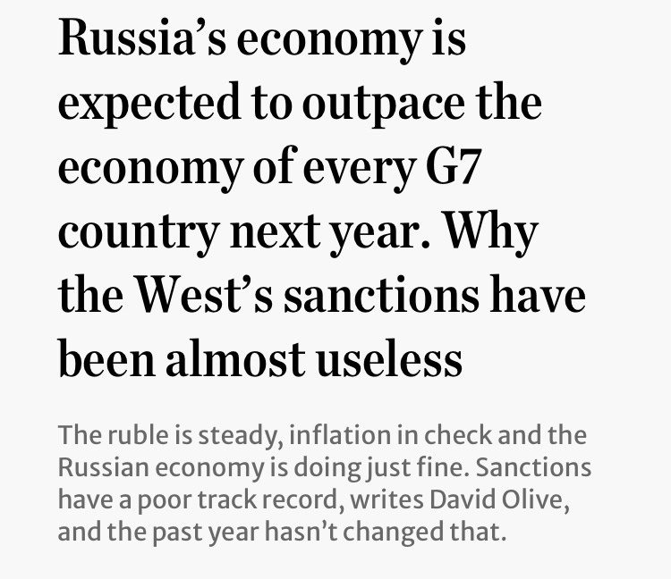 That recent forecast, by the International Monetary Fund (IMF), also predicts that Russian economic growth will outpace that of all G-7 economies next year. The IMF forecasts GDP growth in 2024 of 2.1 per cent for Russia, 1.5 per cent for Canada, and 1.0 per cent for the U.S.