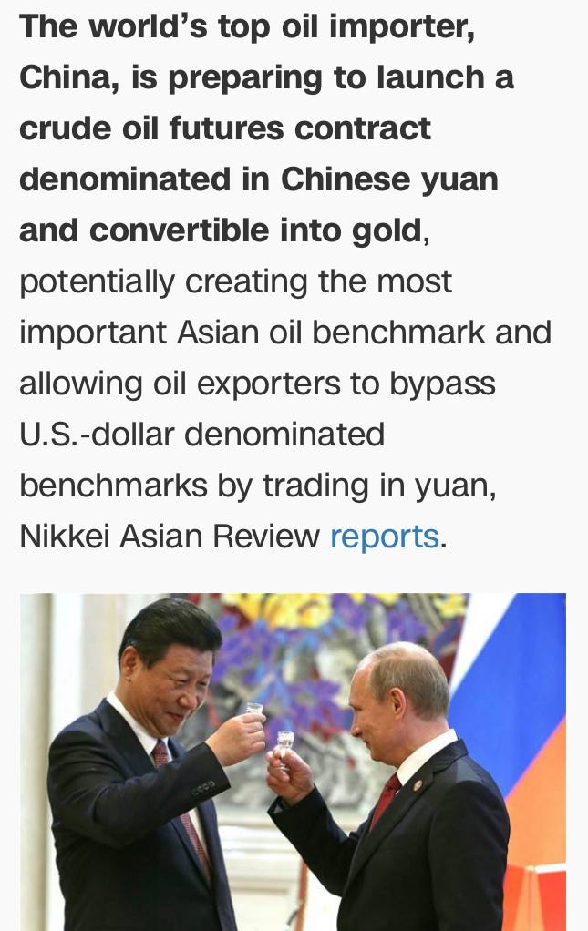 China is offering to buy oil for gold by allowing them to exchange the Yuan for gold. A new gold standard for the purchase of oil.