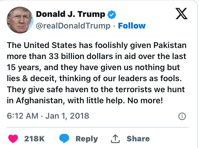 Trump ended up cutting off the aid to Pakistan because they were a safe haven for the terrorists we were fighting in Afghanistan. They also refused to hand over a member of the Haqqani network that they were holding in custody.