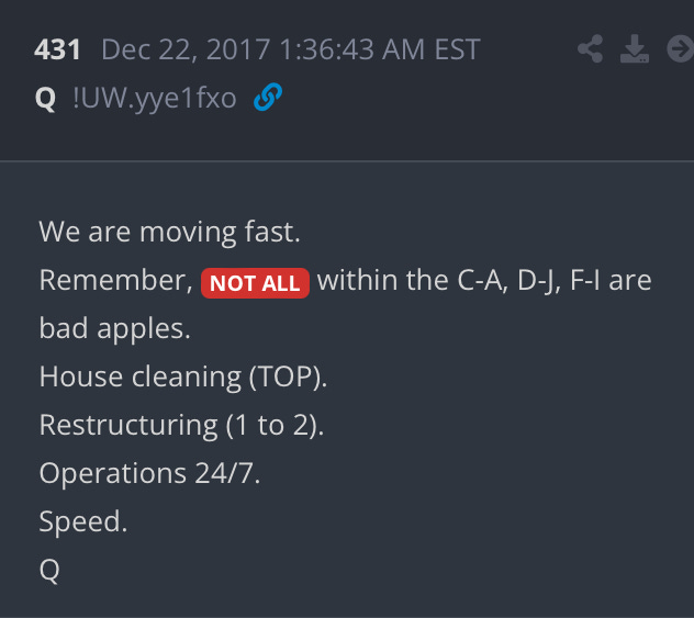 “The truth is, the only real foe we face is a cabal of elite puppet masters. Trump has been cutting the strings of their puppets from day one.”