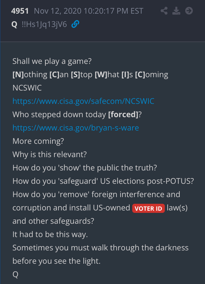 There has always been something I couldn’t figure out about a particular Q drop. Voter ID laws were described in a particular way that seemed confusing to me. The wording was suggesting something that makes sense, but might be hard to implement: