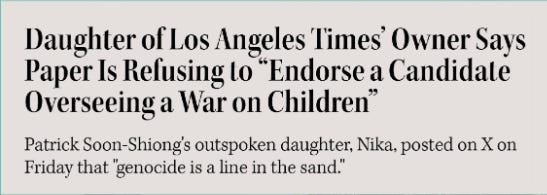 “For my family, Apartheid is not a vague concept.” Maintaining that the decision to endorse was one made by the Los Angeles Times editorial board, Nika added, “This is not a vote for Donald Trump. This is a refusal to ENDORSE a candidate that is overseeing a war on children.”