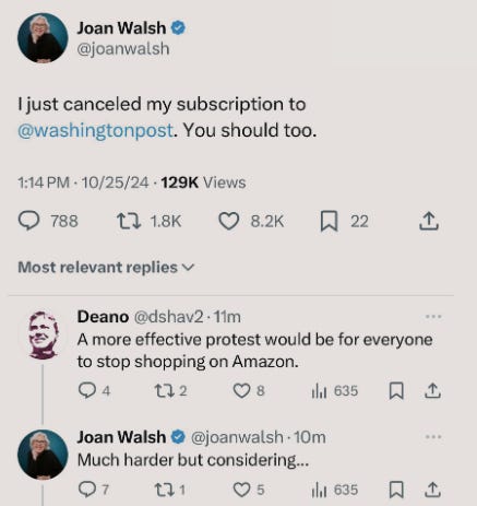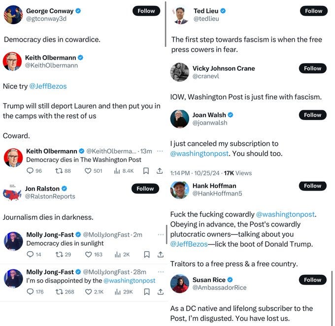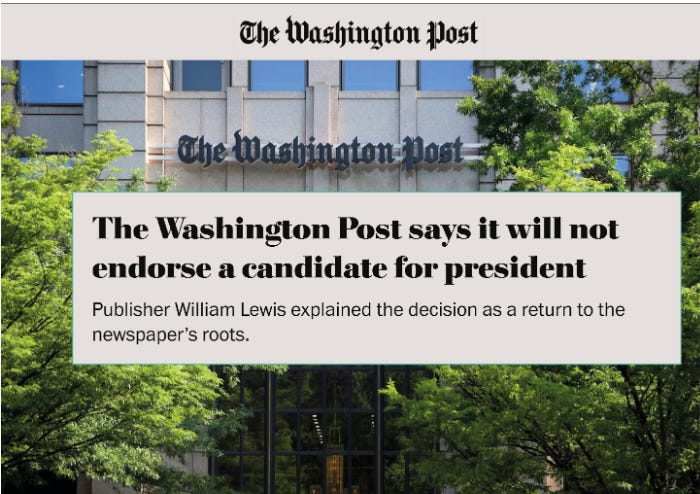 As I mentioned earlier, it was such a given that the Washington Post was going to endorse Kamala that the top editors had already drafted their endorsements preemptively. Needless to say, it came as a shock and was seemingly taken as some great affront when, by all reports, the multi-billionaire owner Jeff Bezos presumably came to the unexpectedly principled decision that the paper should not be in the business of issuing endorsements; not just this cycle, but for all elections going into the future.