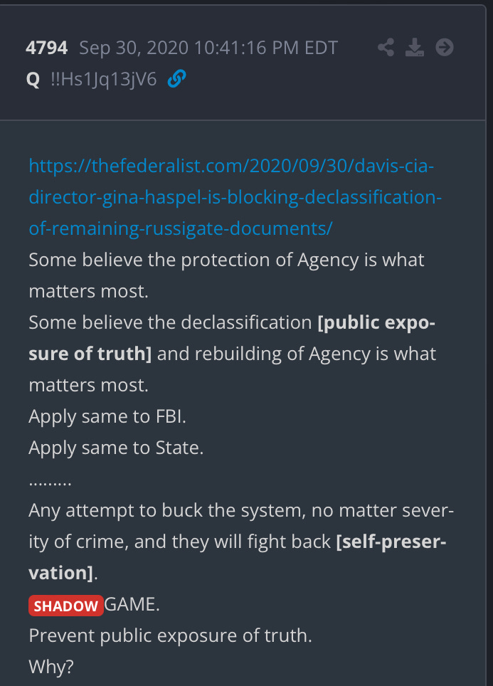 This Q post is talking about the CIA. The link is about the CIA doing everything they can to prevent the “public exposure” of their treason, through declassification of the evidence.