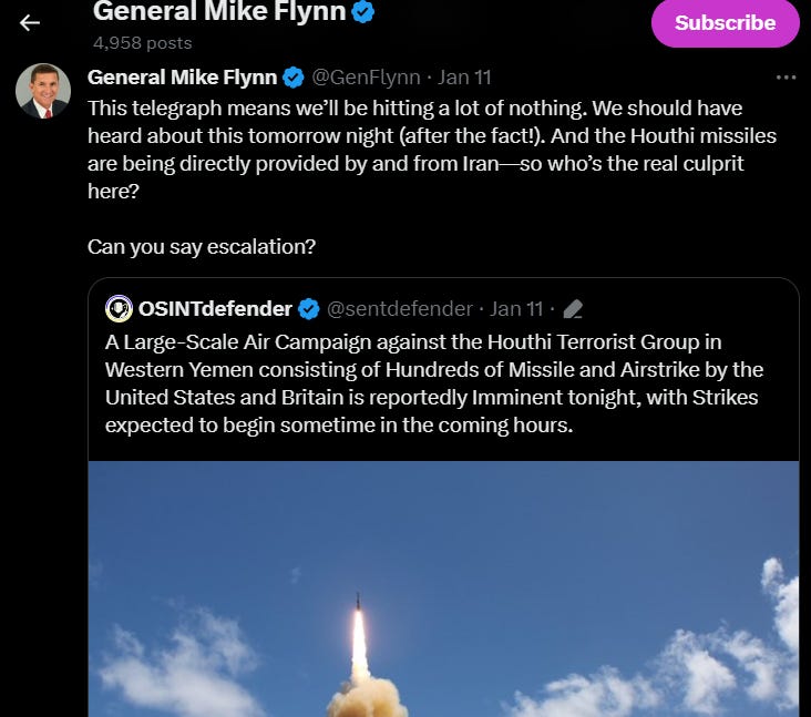 It’s worth noting that as I am writing this, the Houthis, despite how any of us might feel about them, to my knowledge haven’t actually killed anyone in their “harassment campaign,” though the MSM and the Pentagon are already slow rolling a Hollywoodesque narrative designed to elicit further support of the bombing campaign.