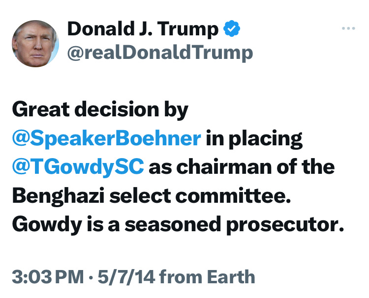 Here was Trump’s first response on this new investigation headed by Gowdy in 2014.