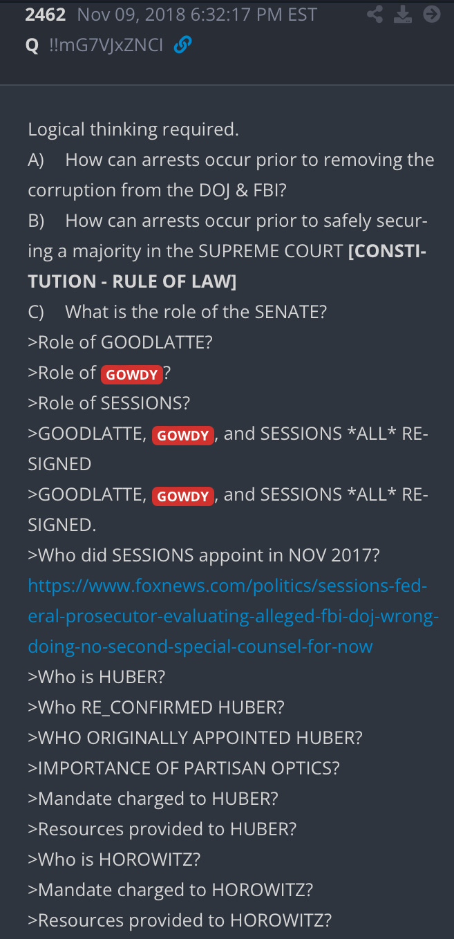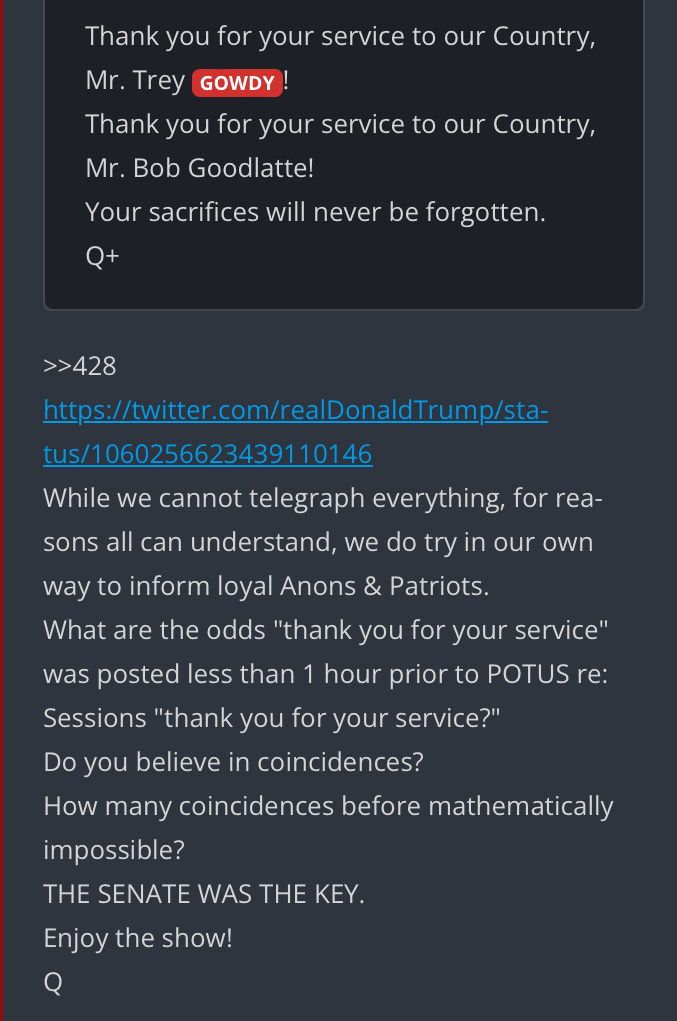 This article may just confirm what I’ve been considering for a long time now, and that Sessions and Gowdy, in particular, have been conducting investigations and possibly even prosecuting traitors in tribunals. I’m from Sessions’s state and have met both men. They have the reputation of not only credibility and expertise, but more importantly, of honesty. There has literally been nothing in local news regarding Jeff Sessions until last month when he commented publicly. I’ve looked for several years now and have been thinking his role may be prosecuting the traitors. Same story with Gowdy. If, as the Q plan states, there will be darkness and then 24-hr playing of tribunals, then the prosecutions will have had to already be in progress. Time will tell, of course.