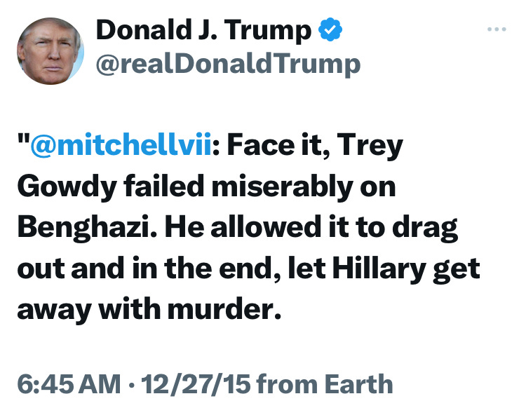 Now remember, Trump was a big supporter of Gowdy when the investigation started, but that changed when he was running for president. Here he is, mentioning Gowdy again in a tweet, about a year and a half later.