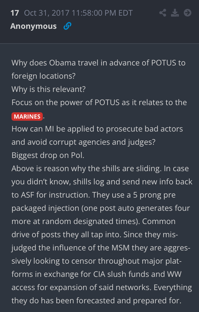 Without giving details, Q pointed us to the possibility of Trump using the Marines for whatever he needed them to do…..”as the President may direct.”