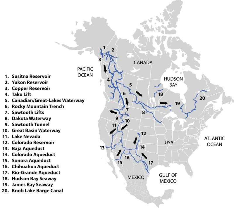 Before making it to the parched south, coming out of the Rocky Mountain trench, the water would be lifted high above sea level via the Sawtooth lifts in Idaho and Oregon, and transiting via canals and tunnels (to avoid evaporation) through Utah, Nevada, California, Arizona, Texas and North Mexico.