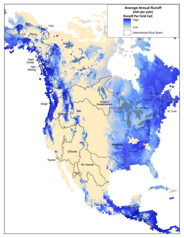North America’s water cycle features an immense amount of rain water and unused water runoff in the north, where there are few people and little industrial activity while there is very little water in the south, where we find high population and agro-industrial activity.