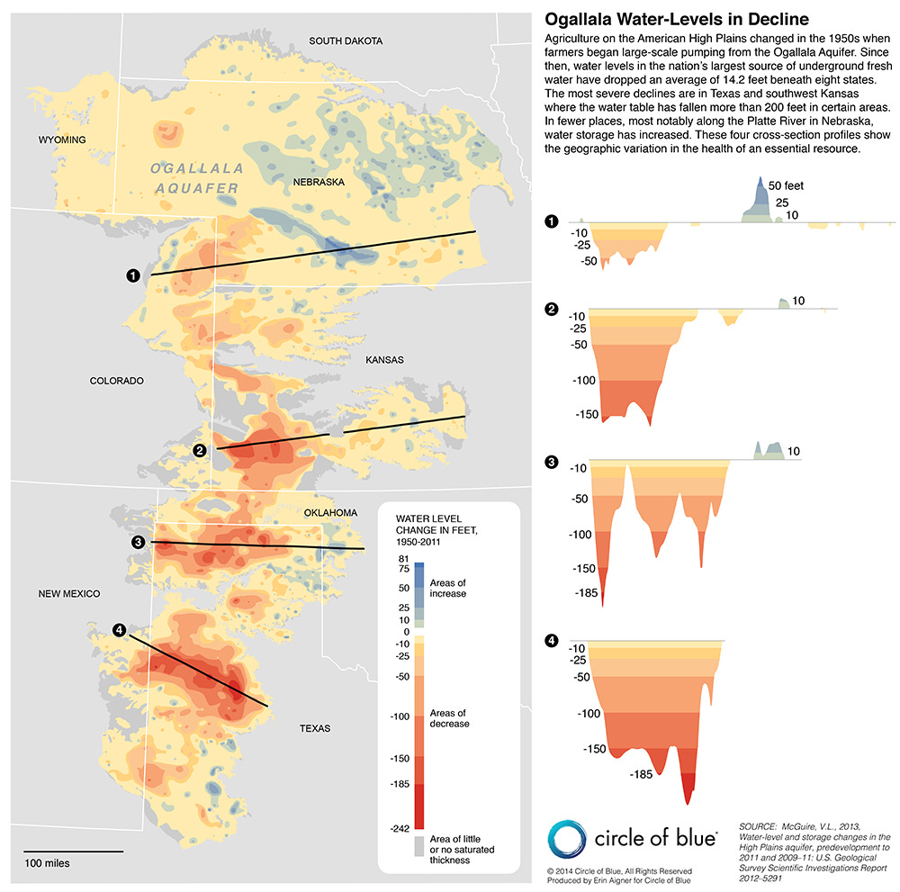 Underground aquifers, which take thousands of years to replenish have historically been a source of water for drought-stricken regions, but as we see with the case of the gigantic Ogallala aquifer providing the High Plains basin, which has dropped by 19 feet in only 17 years, such sources are not going to be there forever.